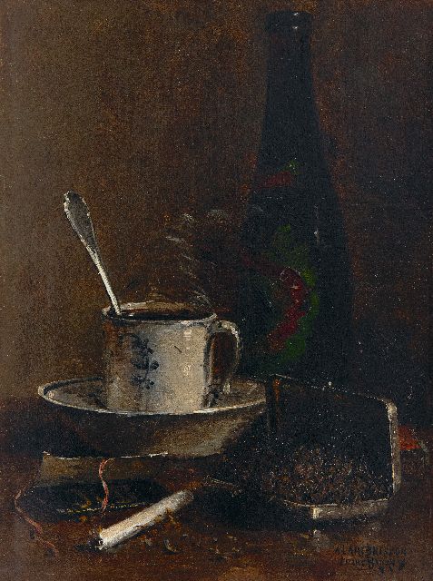 Louis Bigaux | Stilleven met tabaksdoos, sigaret en kop en schotel, olieverf op doek, 32,4 x 24,6 cm, gesigneerd r.o.