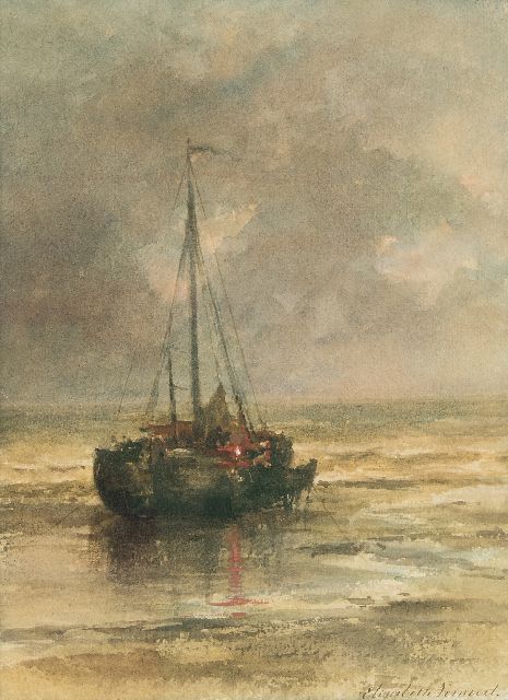 Elisabeth Verwoert | Bomschuit voor anker voor het strand, aquarel op papier, 29,8 x 22,2 cm, gesigneerd r.o.