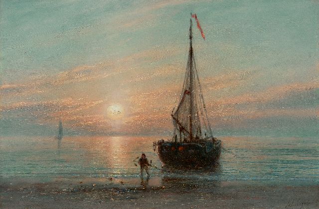 Willem van Deventer | Strandgezicht met vissersschepen bij ondergaande zon, olieverf op papier op paneel, 32,0 x 41,6 cm, gesigneerd r.o.