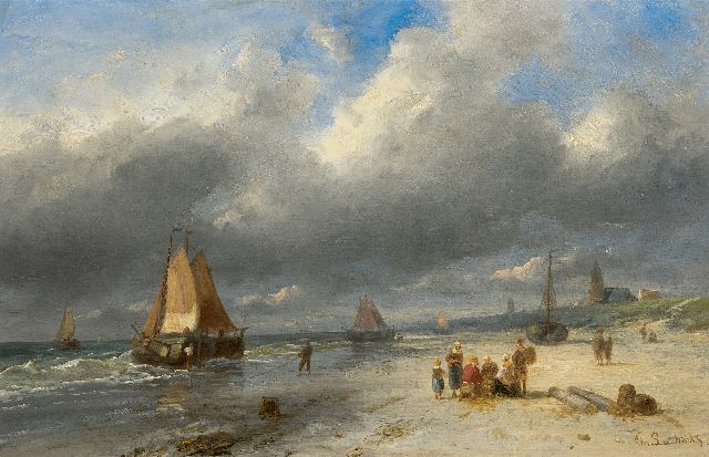 George Willem Opdenhoff | Visserspinken en vissersvolk op het strand van Scheveningen, olieverf op doek, 47,5 x 66,8 cm, gesigneerd r.o.