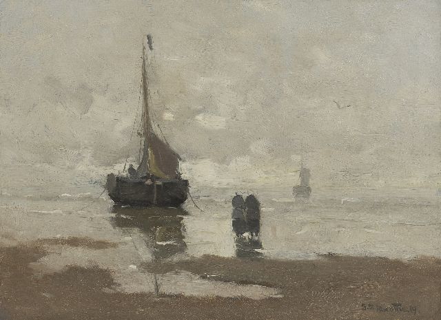 Jacob Maris | Boten en vissers op het strand, olieverf op doek, 46,8 x 55,5 cm, gesigneerd r.o. en te dateren 1890-1895