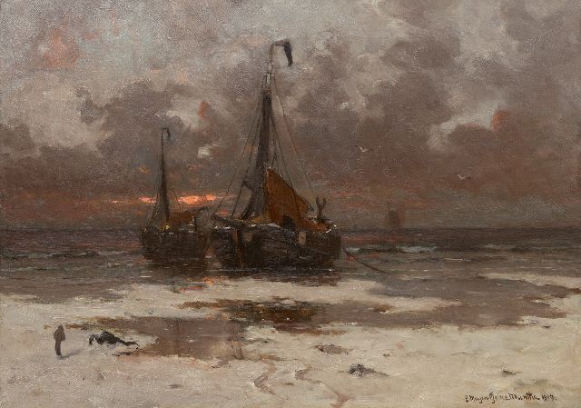 Morgenstjerne Munthe | Vissersboten voor anker bij ondergaande zon, olieverf op doek, 59,0 x 86,7 cm, gesigneerd r.o. en gedateerd 1909