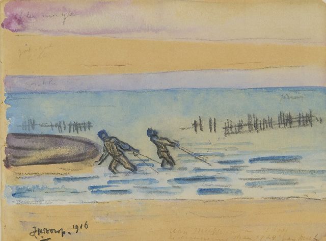 Jan Toorop | Zeeuwse garnalenvissers, zwart krijt en aquarel op papier, 11,4 x 15,1 cm, gesigneerd l.o. en gedateerd 1916
