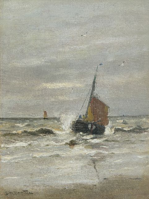 Morgenstjerne Munthe | Bomschuit in woelige branding, olieverf op doek, 40,0 x 49,9 cm, gesigneerd r.o. en gedateerd '14