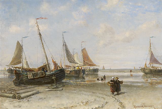 Maurits Verveer | Vissersvrouwen bij pinken langs de vloedlijn, olieverf op doek, 38,8 x 54,9 cm, gesigneerd r.o. en verso