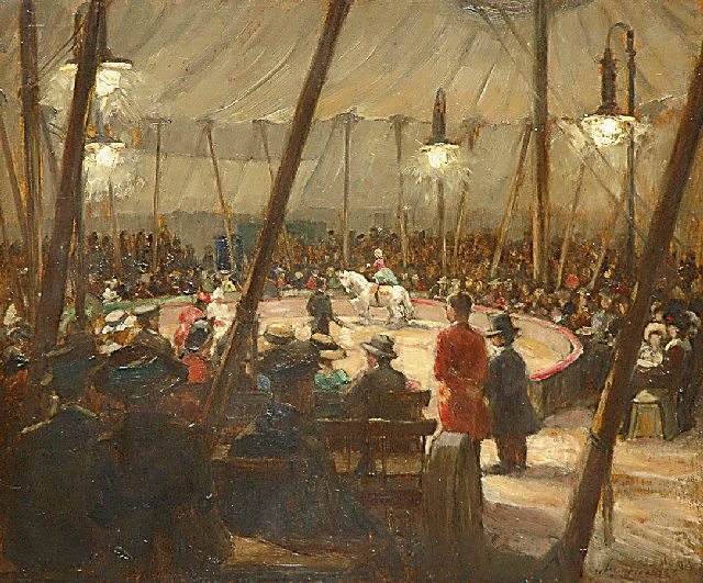August Böcher | De circusvoorstelling, olieverf op paneel, 42,6 x 50,0 cm, gesigneerd r.o.