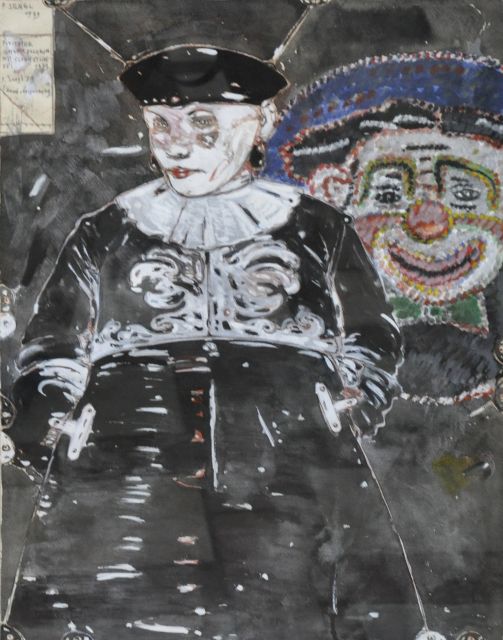 Peter Sengl | Fixierter Schwarzclown mit Clownstickerei, gouache op papier, 60,5 x 46,7 cm, gesigneerd l.b. en gedateerd 1979