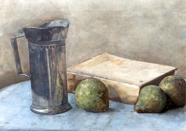 Antje Egter van Wissekerke | Stilleven met tinnen kan, een boek en drie peren, olieverf op doek, 28,6 x 39,0 cm, gesigneerd r.b. met mon. en gedateerd nov. '08
