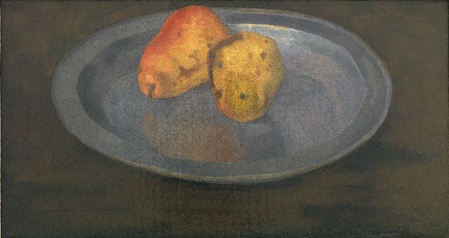 Henk Kuipers | Twee peren op een tinnen bord, olieverf op doek, 27,3 x 50,2 cm, gesigneerd r.o. en gedateerd 1930