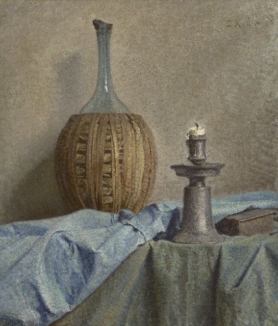Douwe Komter | Stilleven met Chiantifles en tinnen kandelaar, olieverf op schildersboard, 53,9 x 45,9 cm, gesigneerd r.b. met initialen en gedateerd '40
