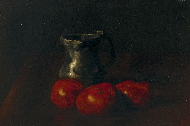 Maarten Jungmann | Stilleven met tinnen kan en tomaten, olieverf op paneel, 23,7 x 32,9 cm, gesigneerd l.o.