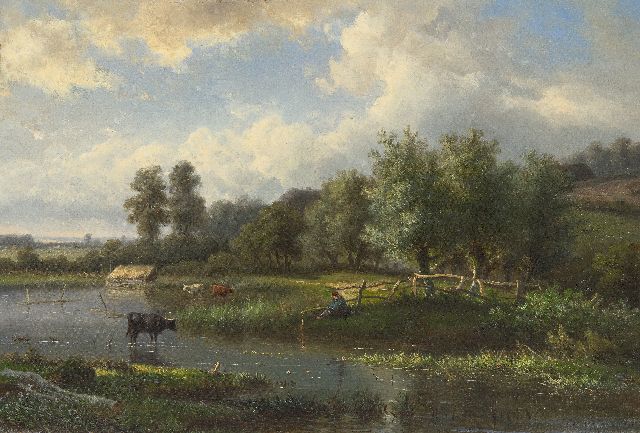 Jan Bedijs Tom | Koeien langs een rivier, mogelijk de Rijn in Gelderland, olieverf op doek, 72,3 x 122,5 cm, gesigneerd r.o. en gedateerd 1874