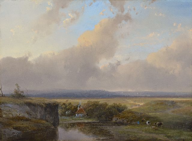 Albert Jurardus van Prooijen | Herderin met koeien langs de oever van een rivier, olieverf op paneel, 19,7 x 29,1 cm, gesigneerd r.o.