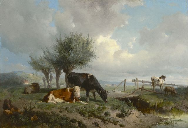 Henriette Ronner | Rustend vee in een wei, Den Bosch in de verte, olieverf op paneel, 33,0 x 39,2 cm, gesigneerd l.o. en gedateerd 1845