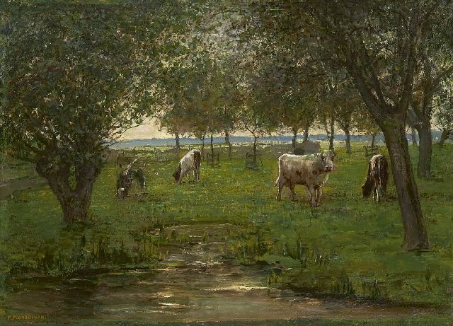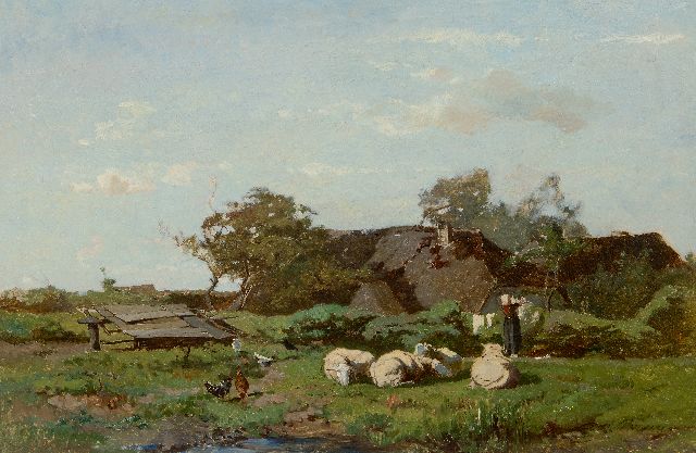 Hendrik Lot | Zomers weidelandschap met koeien en boerin, olieverf op doek, 64,0 x 91,0 cm, gesigneerd r.o.