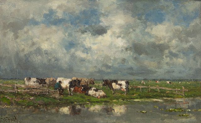Albert Jurardus van Prooijen | Landschap met wadend vee, olieverf op paneel, 8,7 x 15,0 cm, gesigneerd r.o.