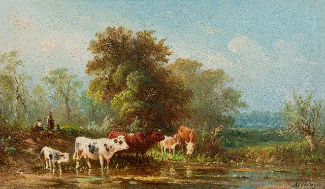 Marinus Adrianus Koekkoek I & Eugène Verboeckhoven | Vee bij een drinkplaats, olieverf op paneel, 44,3 x 56,3 cm, gesigneerd l.o. 'M.A. Koekkoek' en gedateerd 1853