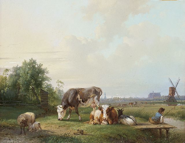 Pieter Plas | Rustend vee en hengelaar in een pastoraal landschap, Alkmaar in het verschiet, olieverf op doek, 44,4 x 55,2 cm, gesigneerd l.o. en gedateerd 1842