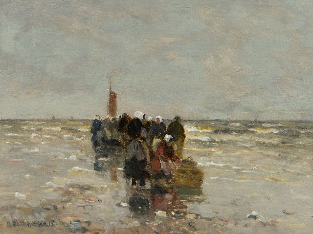 Morgenstjerne Munthe | Visverkoopsters wachtend op het strand van Katwijk, olieverf op paneel, 16,0 x 21,0 cm, gesigneerd l.o. en gedateerd '15