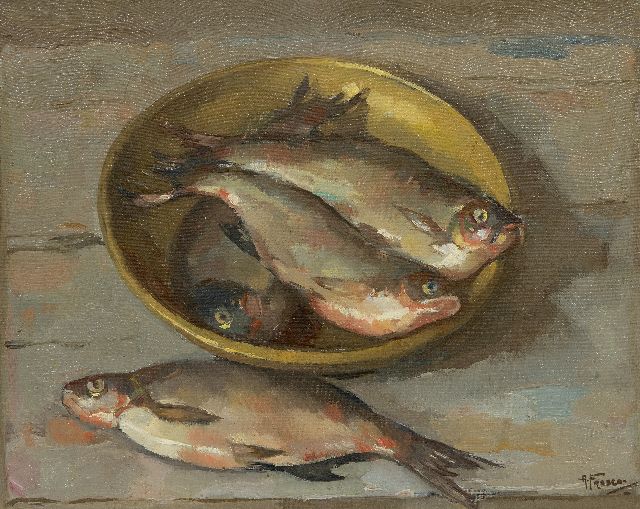 Abraham Fresco | Haringen in een schaal, olieverf op doek, 33,2 x 40,6 cm, gesigneerd r.o.