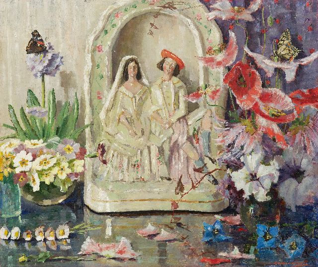 Stilleven met bloemen, vlinders en porseleinen huwelijksbeeldje