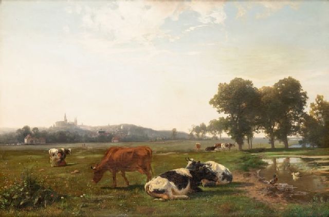 Jean Baptiste De Roy | Herdersjongen met koeien en stier, een stad in de verte, olieverf op paneel, 41,5 x 64,5 cm, gesigneerd r.o. en te dateren ca. 1825-1835
