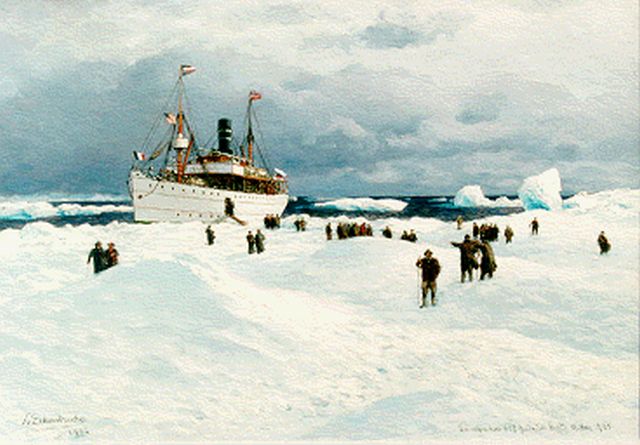 Henri van Daalhoff | IJsvertier op bevroren gracht, olieverf op paneel, 13,0 x 18,0 cm, gesigneerd r.o.