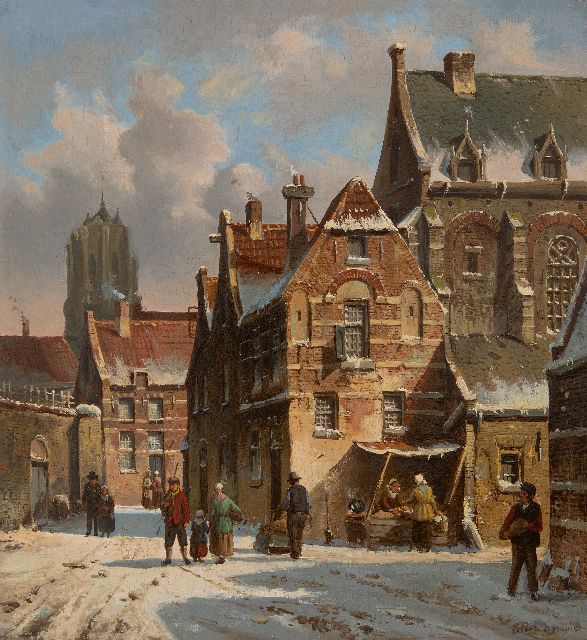 Charles Leickert | Drukbevolkt straatje in de sneeuw, olieverf op doek, 72,7 x 52,0 cm, gesigneerd r.o. en gedateerd '88