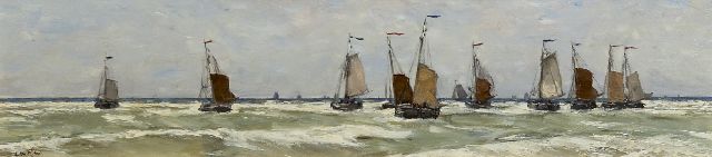 Willem Wenckebach | Uitzeilende bomschuiten, olieverf op paneel, 22,7 x 76,8 cm, gesigneerd r.o. met initialen