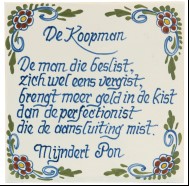 Mijndert was in vele opzichten sterk intuïtief. Eenvoud en wijsheid ‘Platte poten op de grond’ en vooral geen hoogdravend gedoe. Memo’s op een half A4tje. En niet te gecompliceerd, zoals hij mij wel vond. ‘Te veel perfectie duurt te lang Frank’. Zijn kijk op de wereld, zijn handel en wandel, was eigenlijk heel bescheiden: beschouwingen die voor alle mensen opgaan en die je ook wel eens op tegeltjes ziet… Over tegeltjeswijsheid gesproken. Mijndert schreef er zelf één. Over ‘de perfectionist’. Dit tegeltje met rijm hangt altijd bij ons op het herentoilet en toen het opeens ontvreemd was kwam er een reactie uit Nijkerk, een ontwapenende lach: ‘Mijn tegeltje is het dus wáárd om gestolen te worden!’