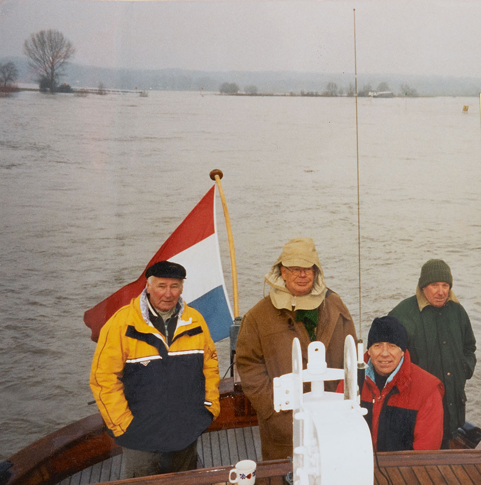 Kort nadien, op een van de boottochten met zijn Koopmans Welvaren over de IJssel onder de meest naargeestige Hollandse weersomstandigheden, striemende wind en koude regen, trok Mijndert in de kajuit nog een vies gezicht… en niet vanwege het weer. Hij bracht de ex- medewerker ter sprake die actief was met ons klantenbestand. ‘Niet meer aan denken en doorgaan met de handel, besteed er verder geen aandacht aan, Frank. Focus op je zaak en vaar je eigen koers’. Vervolgens ontkurkte hij nog een fles Salentein, schonk de glazen vol en loodste zijn schip als een ruige schipper in de bijna vrieskou, in een bruine houtje-touwtje jas, met zijn vrienden om hem heen, de haven in. Ik maakte er een foto van.