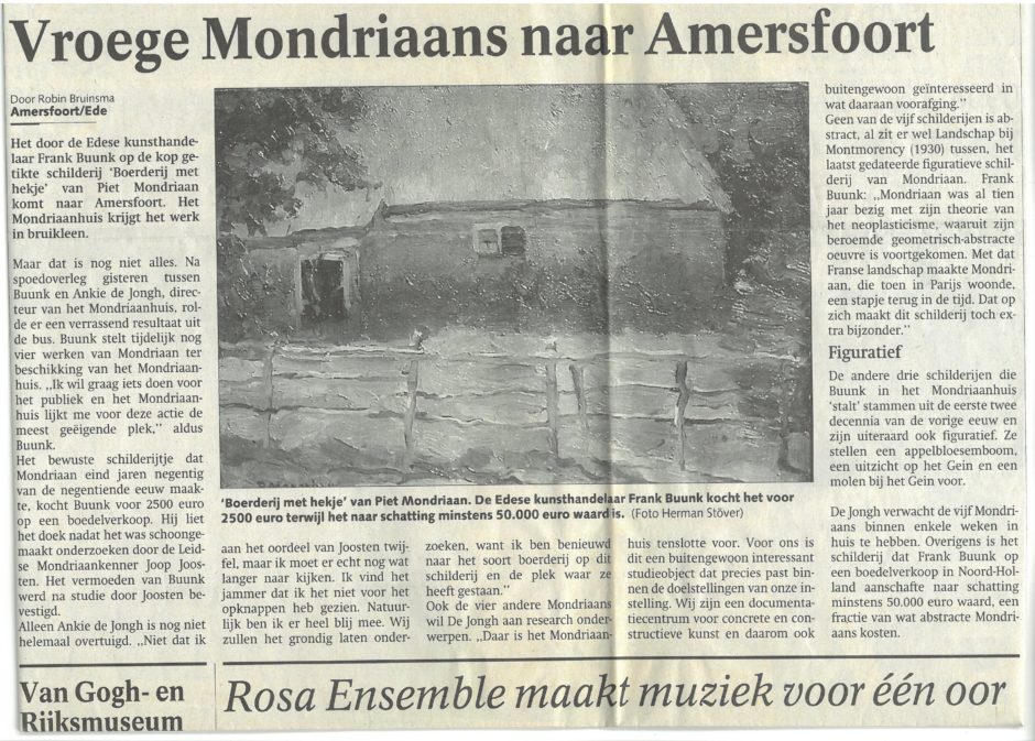 Het door de Edese kunsthandelaar Frank Buunk op de kop getikte schilderij ‘Boerderij met hekje’ van Piet Mondriaan komt naar Amersfoort. Het Mondriaanhuis krijgt het werk in bruikleen.
