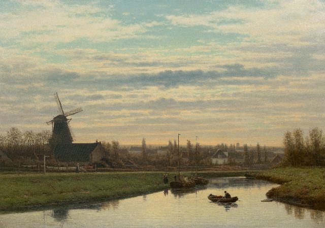 Afgemeerde werkschepen voor de Amsterdamse Haarlemmersluis bij de Ronde Lutherse Kerk, olieverf op doek57,9 x 42,4 cm, gesigneerd r.o. en gedateerd 1890
