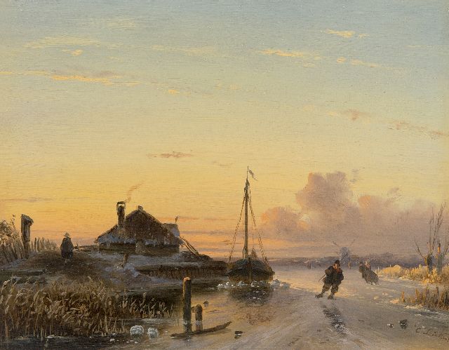 Ontmoeting bij het meer, olieverf op board op paneel20,9 x 28,1 cm, gesigneerd l.o. (vaag)