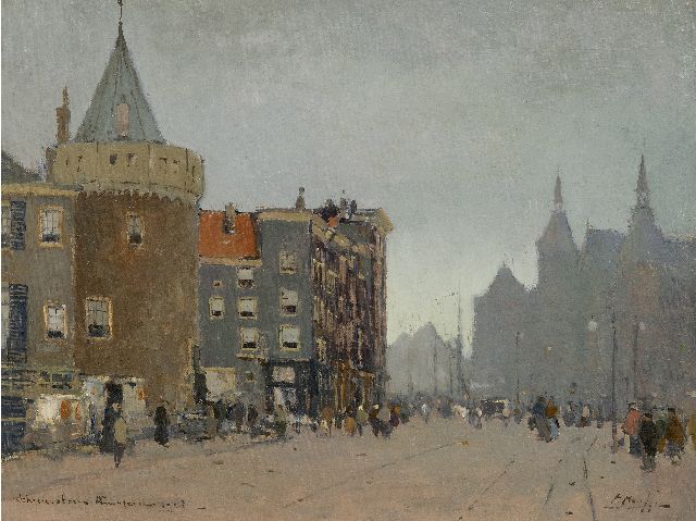 Gezicht op een stad (Amsterdam), olieverf op doek 31,3 x 44,9 cm, gesigneerd r.o. en jaren '80