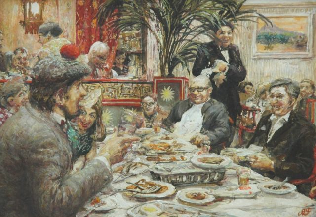De schilder ontmoet twee dames in de nacht, olieverf op doek 70,2 x 79,7 cm, gesigneerd l.o.